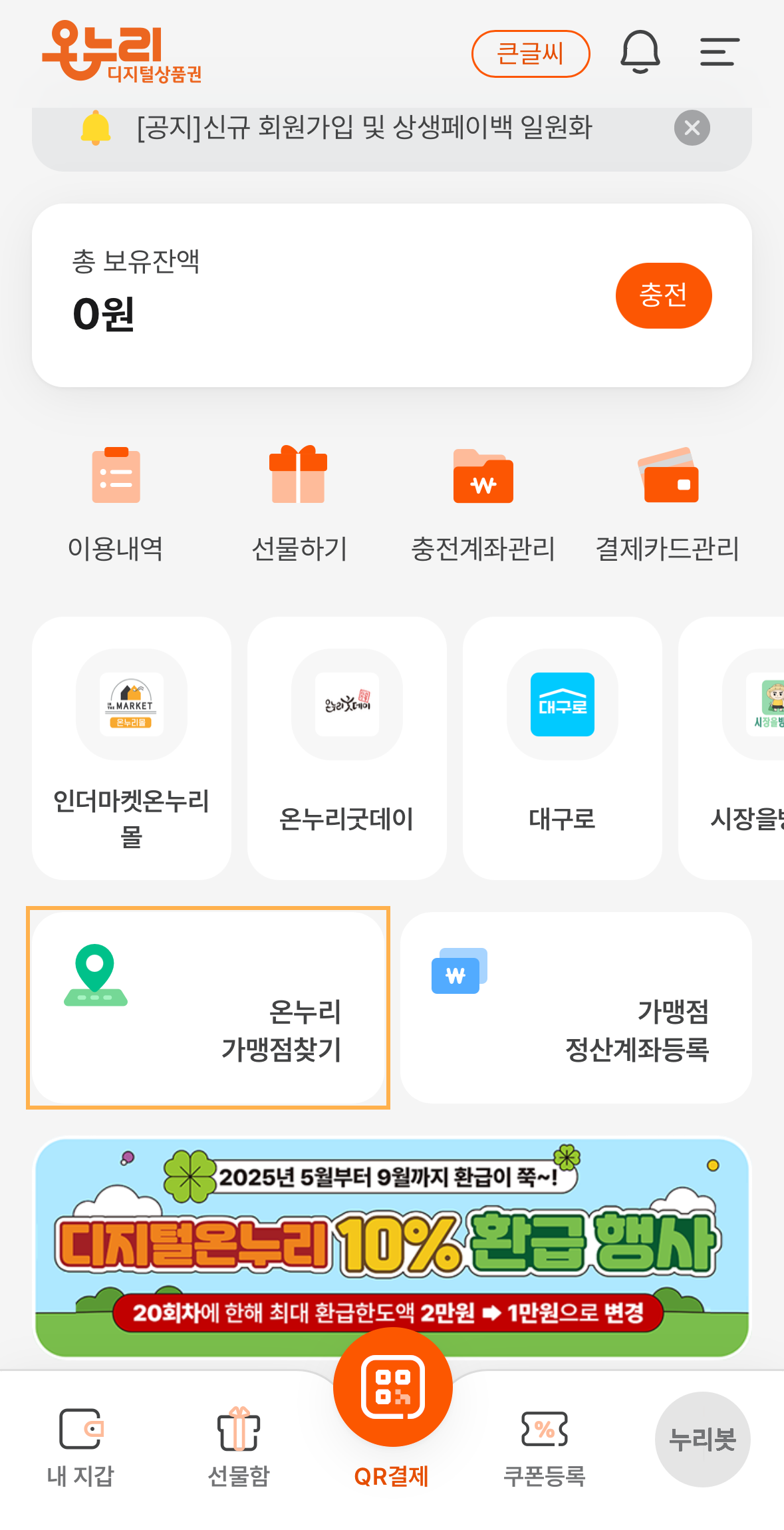 - 앱 실행 → 바코드 또는 QR코드 보여주기 또는 매장 QR을 스캔 → 결제 완료. 잔액이 부족할 경우 카드·현금 등 다른 결제 수단과 함께 사용 가능합니다.